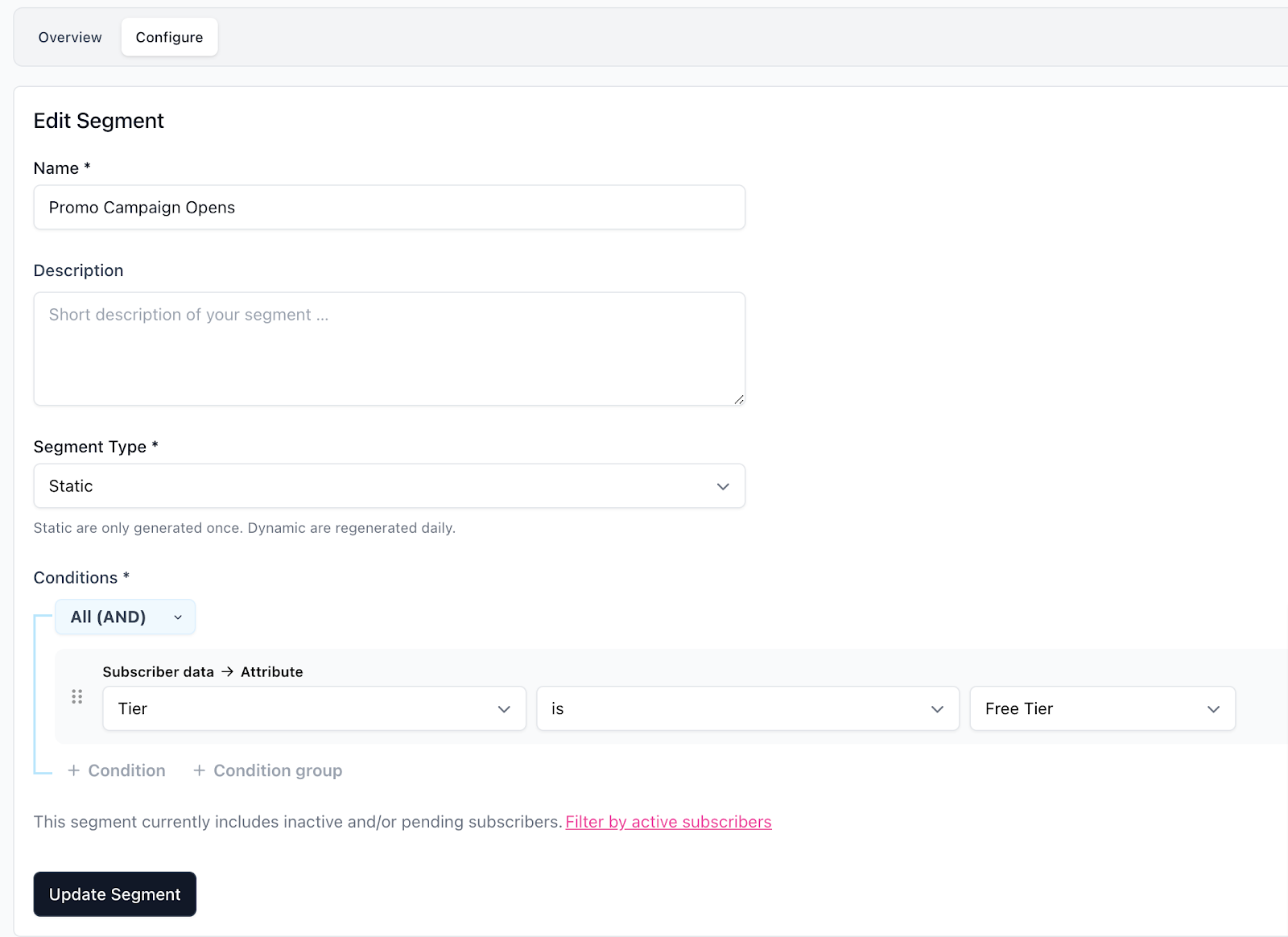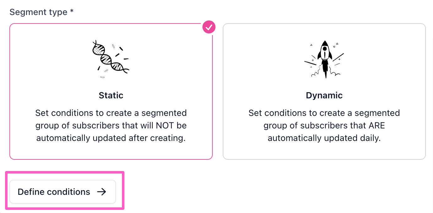 - Static: Subscribers are aggregated at the time of creation and the segment does not update automatically.