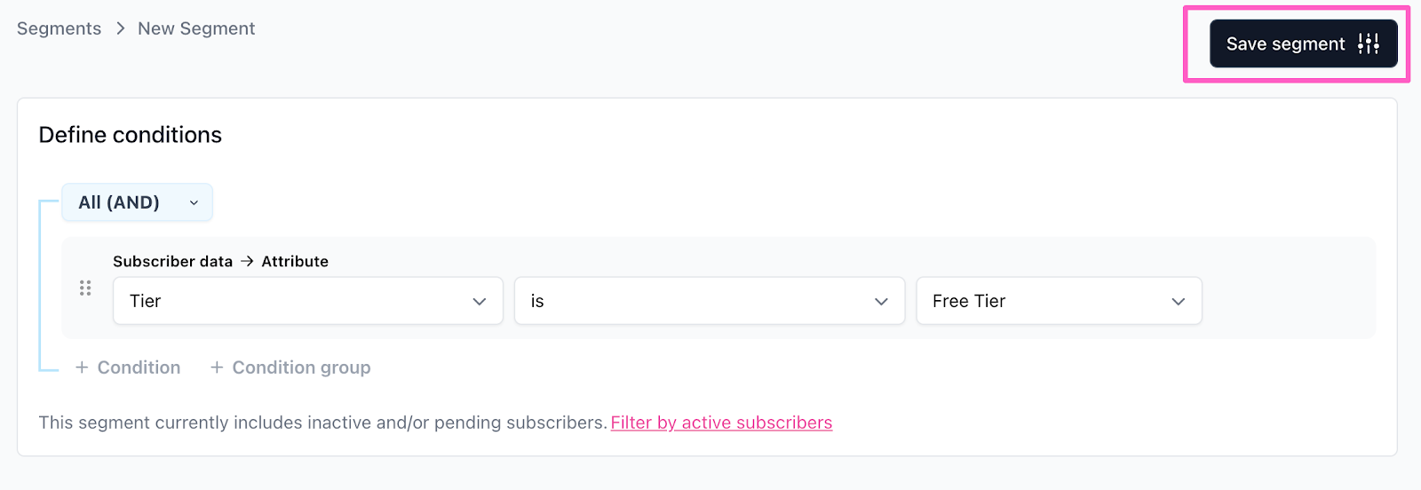 Add as many conditions as needed, then click Save segment when done. - Once saved, you’ll be taken to the segment’s dashboard.