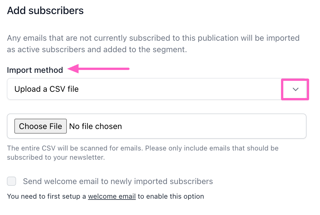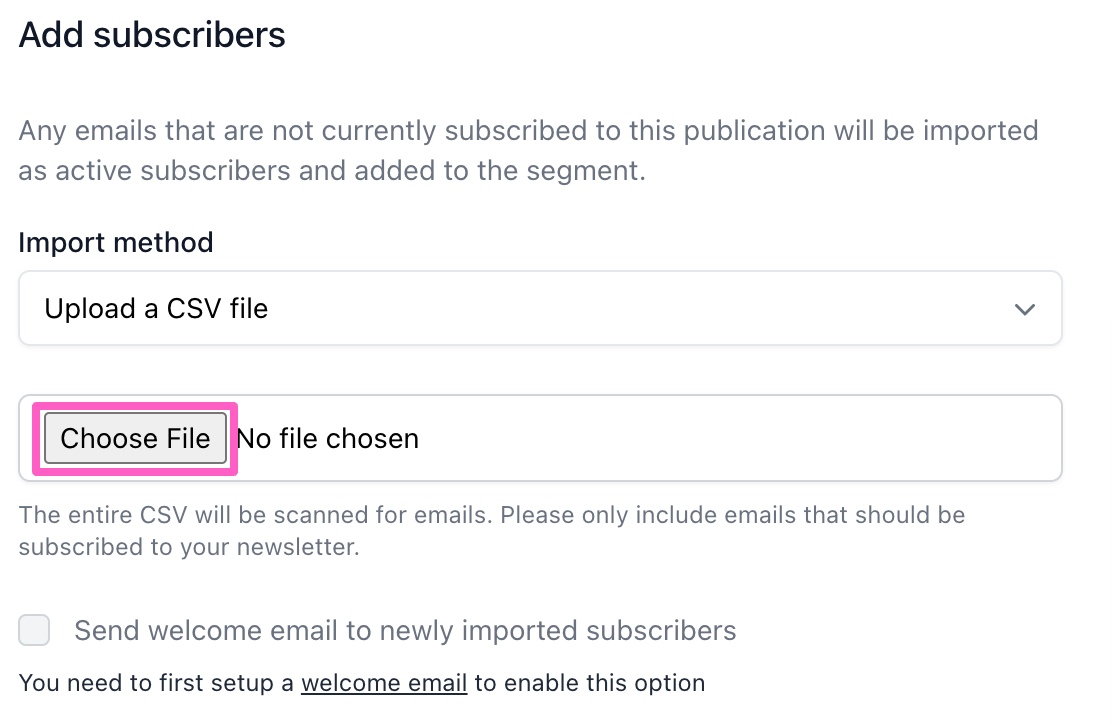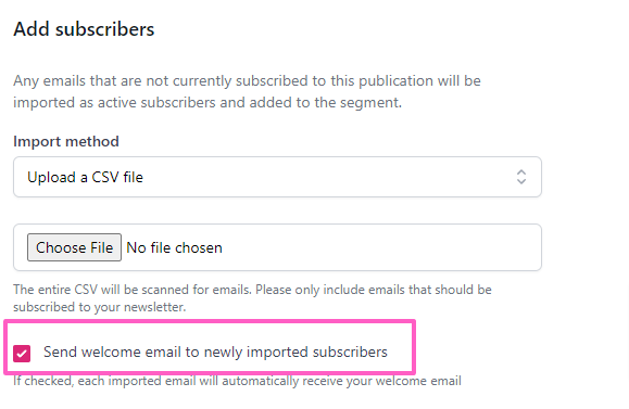 If you'd like to send a welcome email to newly imported subscribers, check the Send welcome email box; doing so will automatically send your welcome email to any new subscribers from the list.