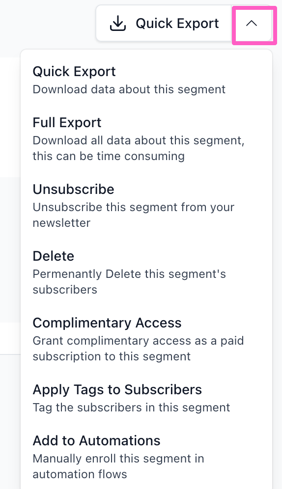 Click the dropdown menu next to Quick Export to access additional tools for managing your segment: